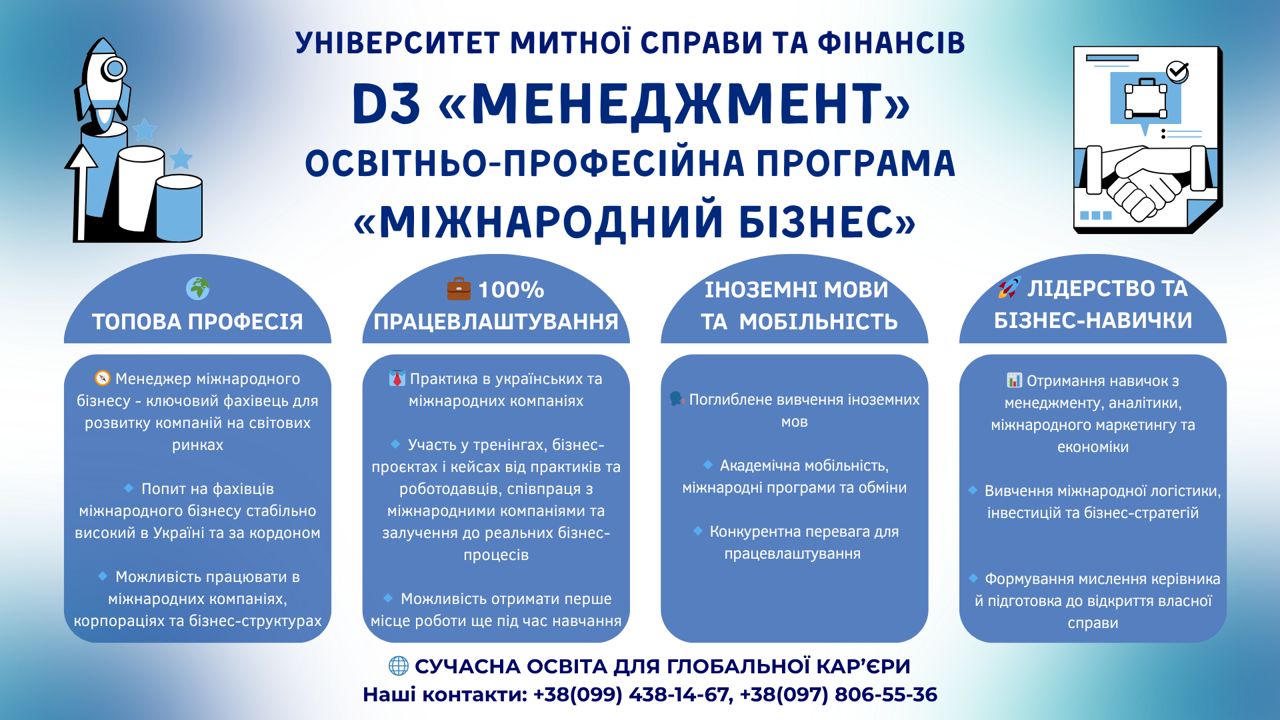 Освітня програма поглиблює фахові управлінські компетентності за рахунок знань та навичок у сфері міжнародного бізнесу, а також передбачає обов’язкове вивчення двох іноземних мов. До проведення навчальних занять залучаються фахівці-практики.