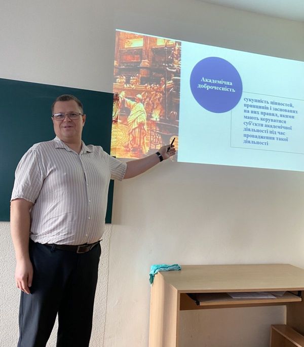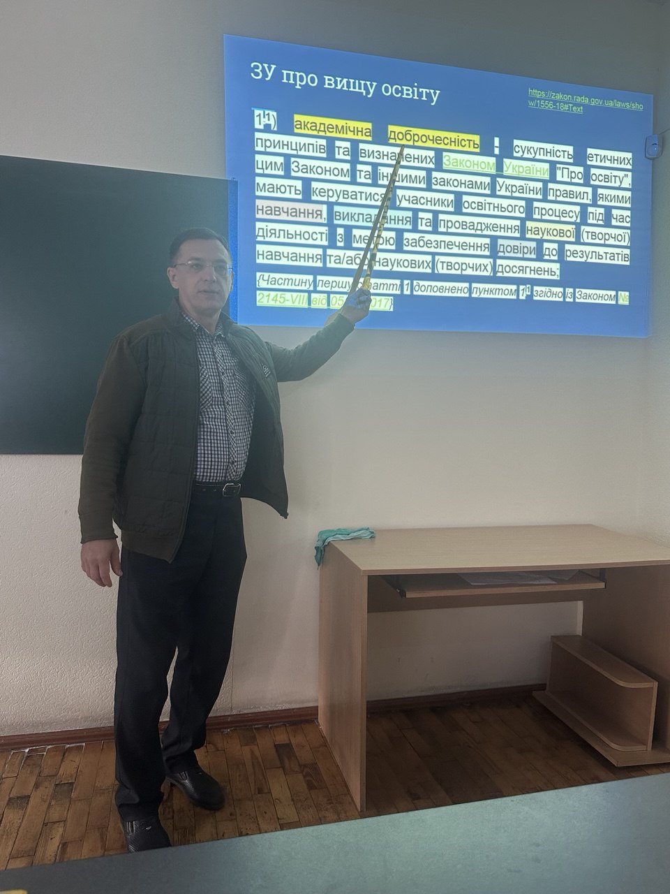 У п’ятницю, 26 вересня, доцент кафедри Анатолій Мазур також провів зустріч зі студентами, під час якої акцентував увагу на нормативно-правових та морально-етичних засадах академічної доброчесності. Особлива увага була приділена положенням Закону України «Про вищу освіту» та документах УМСФ, які регламентують академічну діяльність студентів.