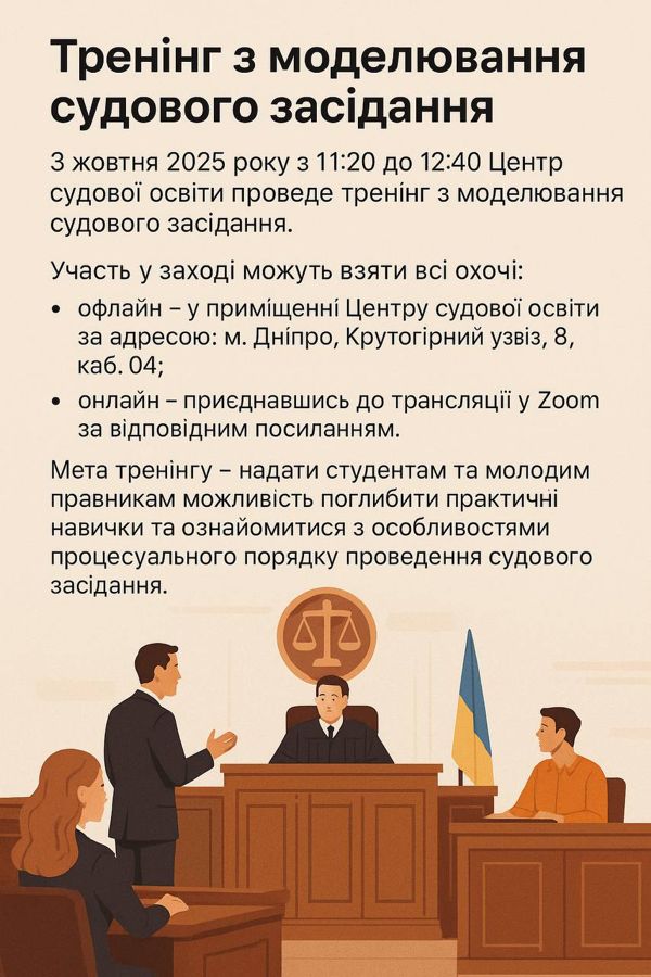 3 жовтня 2025 року з 11:20 до 12:40 Центр судової освіти проведе тренінг з моделювання судового засідання.