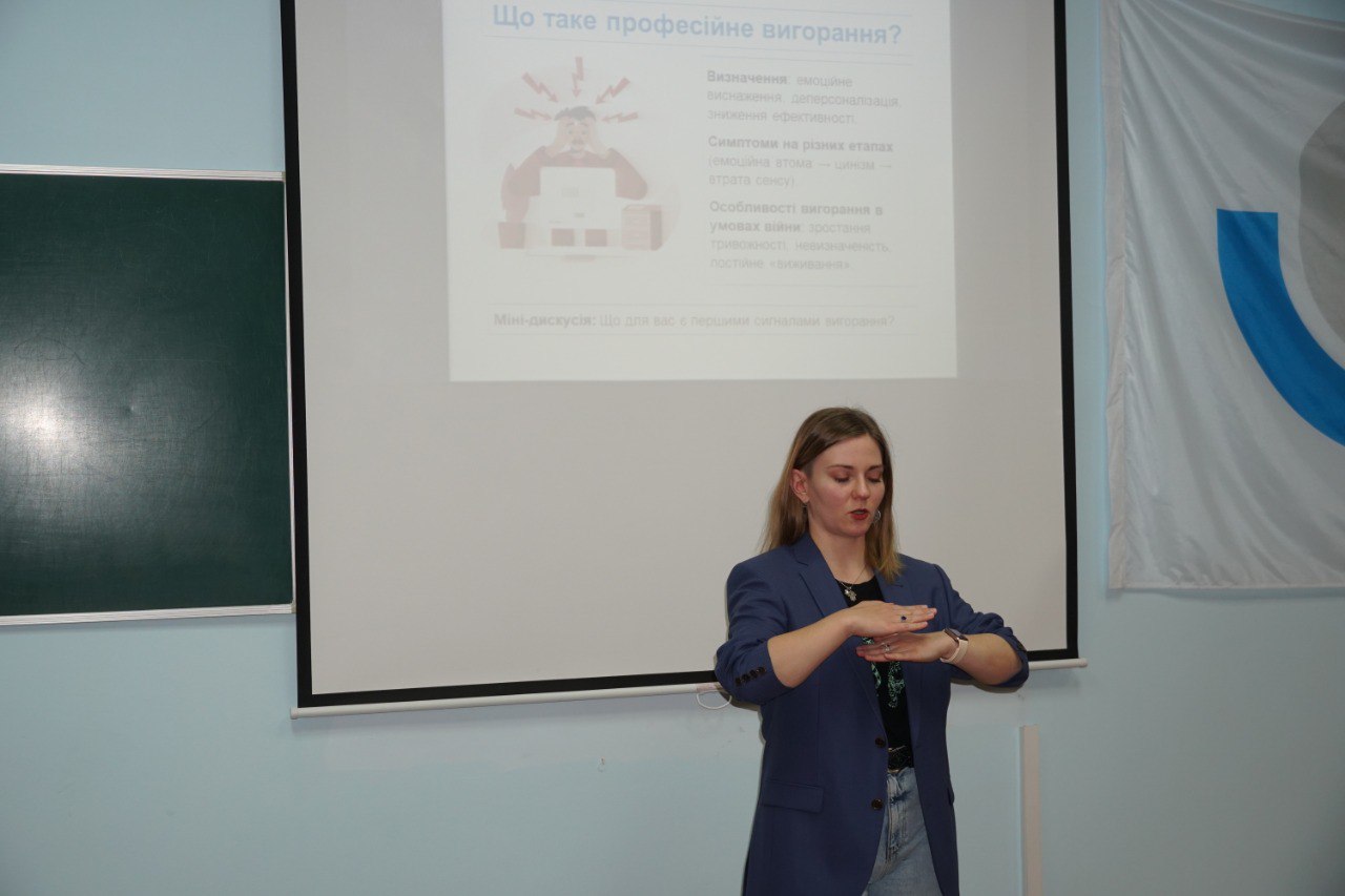 Професійне вигорання в системі професій «людина-людина» є особливо актуальною проблемою під час повномасштабної війни, тому що саме фахівці «допомагаючих» професій мають зараз найбільше напруження – треба бути самому стійким, щоб принести користь іншим. Тому тема, яка була розкрита, викликала велику зацікавленість слухачів. Учасники дізналися як виявити у себе вигорання, де знайти ресурси для виходу з цього стану, на якому етапі вже треба обов’язково звернутися за професійною допомогою і як зрозуміти різницю між вигоранням та депресією чи іншими тяжкими психічними захворюваннями.