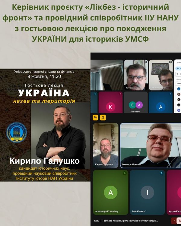 8 жовтня 2025 року на базі кафедри історії та теорії держави й права Навчально-наукового Інституту права та міжнародно-правових відносин УМСФ для студентів спеціальності "Історія та археологія" та поціновувачів вітчизняної історії була проведена гостьова лекція відомого українського історика, кандидата історичних наук, провідного наукового співробітника Інституту історії Національної Академії наук України, координатора та керівника проекту «Лікбез - історичний фронт», автора наукових та науково-популярних книг, підручників: «Консерватор на тлі доби. В. Липинський та суспільна думка європейських «правих», «Британія у стародавню та середньовічну добу», «Давня Шотландія», спеціаліста з історичної картографії – Кирила Галушко.
