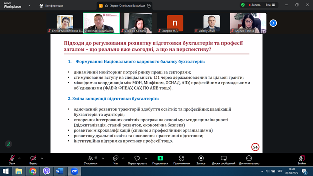 На заході обговорювались результати вступної кампанії 2025 за спеціальностями та регіонами, були проаналізовані запити ринку праці до професії бухгалтера та аудитора, вимоги роботодавців щодо досвіду, освіти та професійних навичок кандидатів. У доповіді зроблено прогноз ступеня дефіциту кадрів  на 10-річний період  та обговорені заходи щодо регулювання підготовки бухгалтерів та професії загалом. Зацікавленість у слухачів викликало дослідження еволюції трансформації місії бухгалтерського обліку та професії бухгалтера під впливом науково-технічного прогресу.