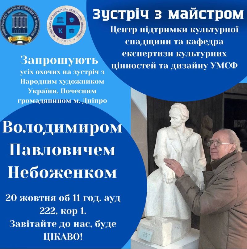 Центр підтримки культурної спадщини та кафедра експертизи культурних цінностей та дизайну Університету митної справи та фінансів запрошують усіх охочих на творчу зустріч із Народним художником України, Почесним громадянином міста Дніпро — Володимиром Павловичем Небоженком.