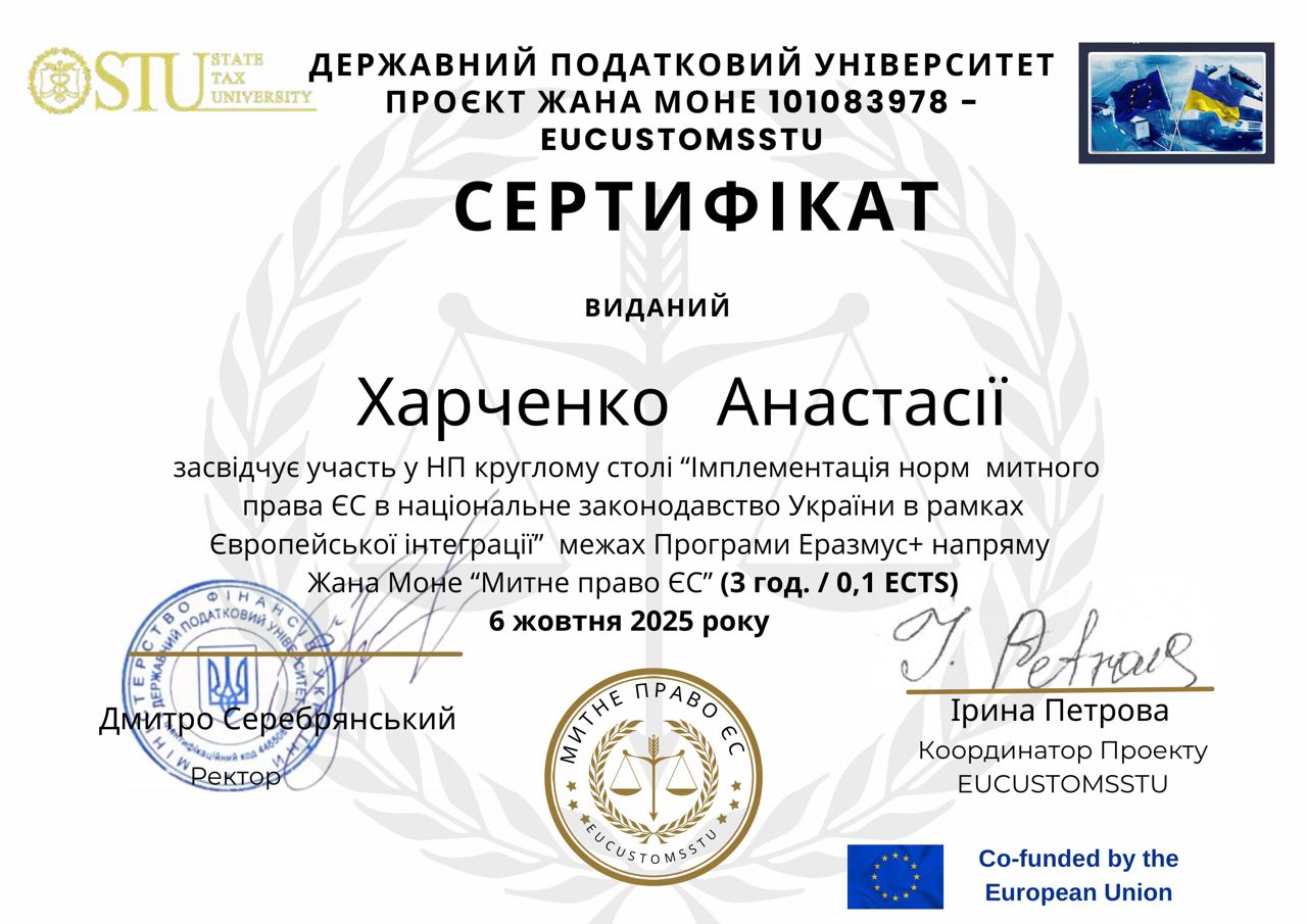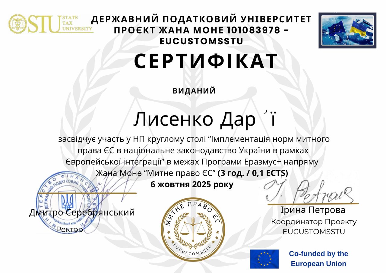6 жовтня 2025 року завідувач кафедри міжнародного права Сергій ПЕРЕПЬОЛКІН, спільно зі студентами навчальної групи МП 25-1 ННІ права та міжнародно-правових відносин, взяли участь у науково-практичному круглому столі «Імплементація норм митного права ЄС в національне законодавство України в рамках європейської інтеграції», який відбувся на базі Державного податкового університету, в межах реалізації Проєкту ЄС Еразмус+ Жан Моне Модуль «Митне право ЄС». Під час заходу відбулася жвава дискусія щодо процесу наближення України до стандартів Європейського Союзу у галузі митного права. Учасники обговорили низку важливих питань, зокрема: особливості діяльності митних органів України, результати виконання рекомендацій Європейської Комісії у цій галузі, а також ключові положення проєкту нового Митного кодексу України. Участь представників спеціальності «Міжнародне право» УМСФ вдало поєдналася з темою науково-дослідної роботи кафедри міжнародного права та тематикою наукових пошуків членів одного з її студентських гуртків, а саме, спеціалізованого гуртка з конституційного права та права Європейського Союзу. За підсумками заходу його учасники отримали сертифікати про участь, які в майбутньому можуть бути визнані як доказ участі у неформальній освіті для зарахування додаткових балів в рамках науково-творчої діяльності за освітніми компонентами «Вступ до спеціальності» та «Конституційне право».