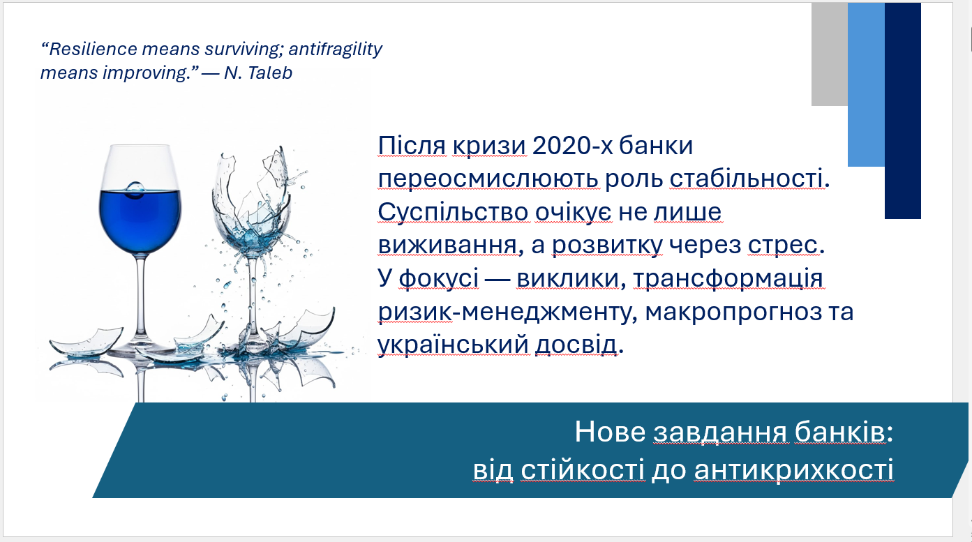 Віце-президент Асоціації "Дніпровський Банківський Союз", незалежний член наглядової ради, голова комітету з управління ризиками комерційного банку Сергій Згонік представив розгорнуту аргументацію на тему «Антикрихкість і трансформація банківської системи». Запрошуємо розглянути цікаву презентацію на цю тему!