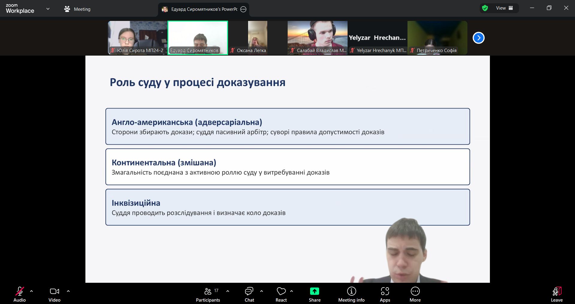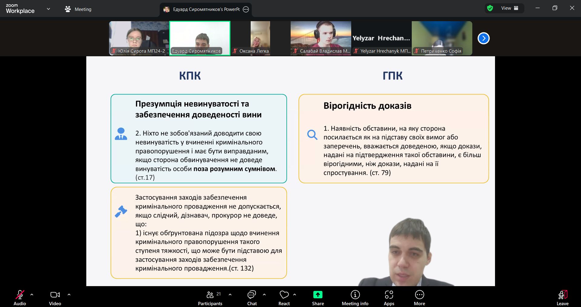 04 листопада 2025 року об 11.20, професором кафедри міжнародного права Легкою О.В. разом із адвокатом, партнером Адвокатського об’єднання «Новум» Едуардом СИРОМЯТНИКОВИМ в системі Zoom було проведено лекційне заняття для студентів груп МП-24-1,2 із навчальної дисципліни «Адміністративне право та адміністративне судочинство» на тему «Докази в адміністративному судочинстві». Під час лекційного заняття Едуард СИРОМЯТНИКОВ охарактеризував: докази як правову категорію, види доказів в адміністративному судочинстві, докази і доказування у практиці Касаційного адміністративного суду. Лекція пройшла продуктивно і спонукала слухачів до осмислення теоретичних питань та обговорення практичних викликів в адміністративному судочинстві. Едуард СИРОМЯТНИКОВ відповів на питання студентів.