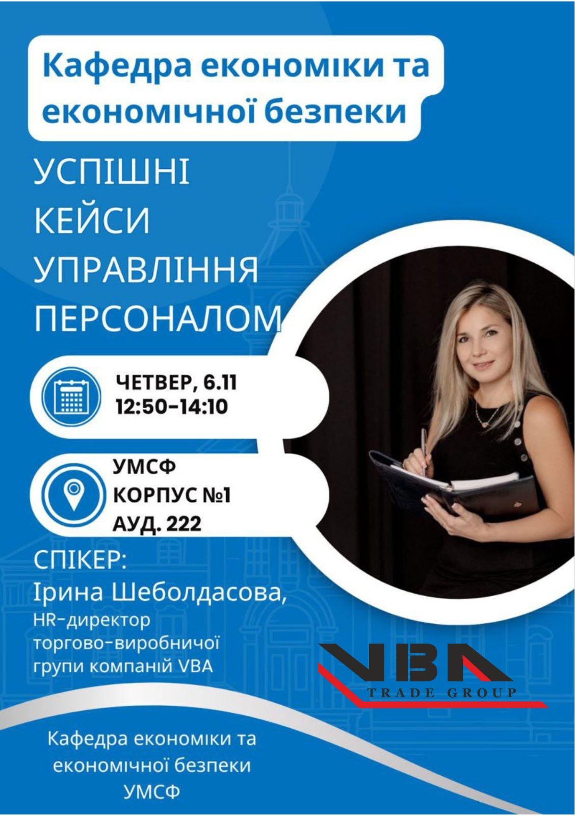 2)від торгово-виробничої групи компаній VBA — «Успішні кейси управління персоналом», Спікер Ірина Шеболдасова, HR-директор, поділилася успішними кейсами управління персоналом;