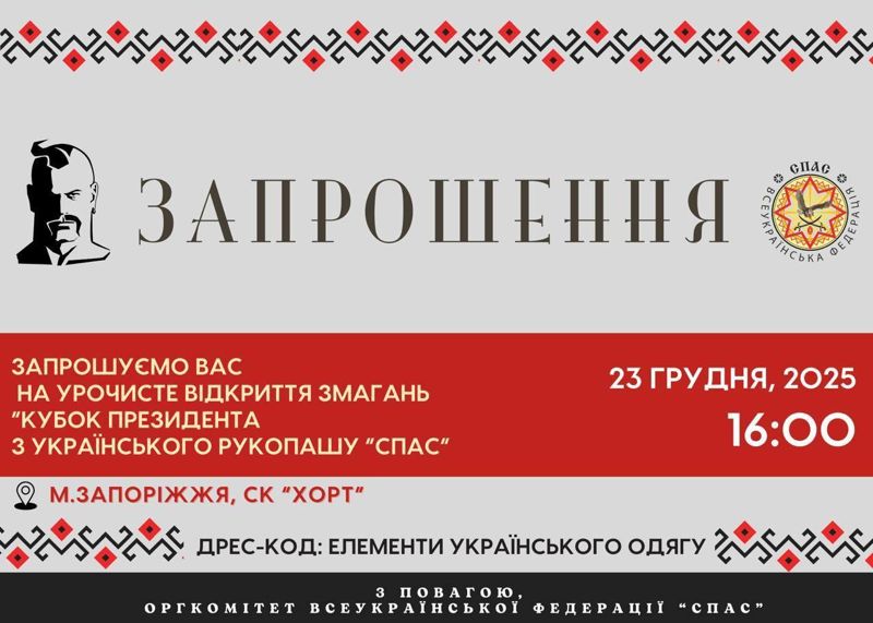 Запрошуємо на урочисте відкриття змагань «Кубок Президента з українського рукопашу “Спас”», яке відбудеться 23 грудня 2025 року о 16:00 у місті Запоріжжя, СК «Хорт».
