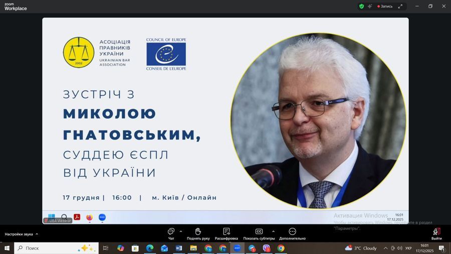 17 грудня 2025 року НПП кафедри міжнародного права і здобувачі вищої освіти спеціальності міжнародне право УМСФ взяли участь у зустрічі з Миколою ГНАТОВСЬКИМ, суддею ЄСПЛ від України. Співорганізаторами заходу виступили: Інститут прав людини Асоціації правників України, Проєкти Ради Європи «Зміцнення прав людини в системі кримінальної юстиції України – Фаза II» та «Підтримка України у впровадженні стандартів Ради Європи щодо судової влади». Микола Гнатовський – український юрист і науковець. Суддя Європейського Суду з прав людини з 27 червня 2022. Професор кафедри міжнародного права Інституту міжнародних відносин Київського національного університету імені Тараса Шевченка. Перший віце-президент ВГО «Українська асоціація міжнародного права». Член Європейського та Американського товариств міжнародного права. На зустрічі обговорювались питання: еволюції Конвенції про захист прав людини та основоположних свобод 1950 р.; пріоритетності справ ЄСПЛ; типовості помилок при подачі заяв до ЄСПЛ; ролі українських юристів і адвокатів у формуванні сучасної практики ЄСПЛ.