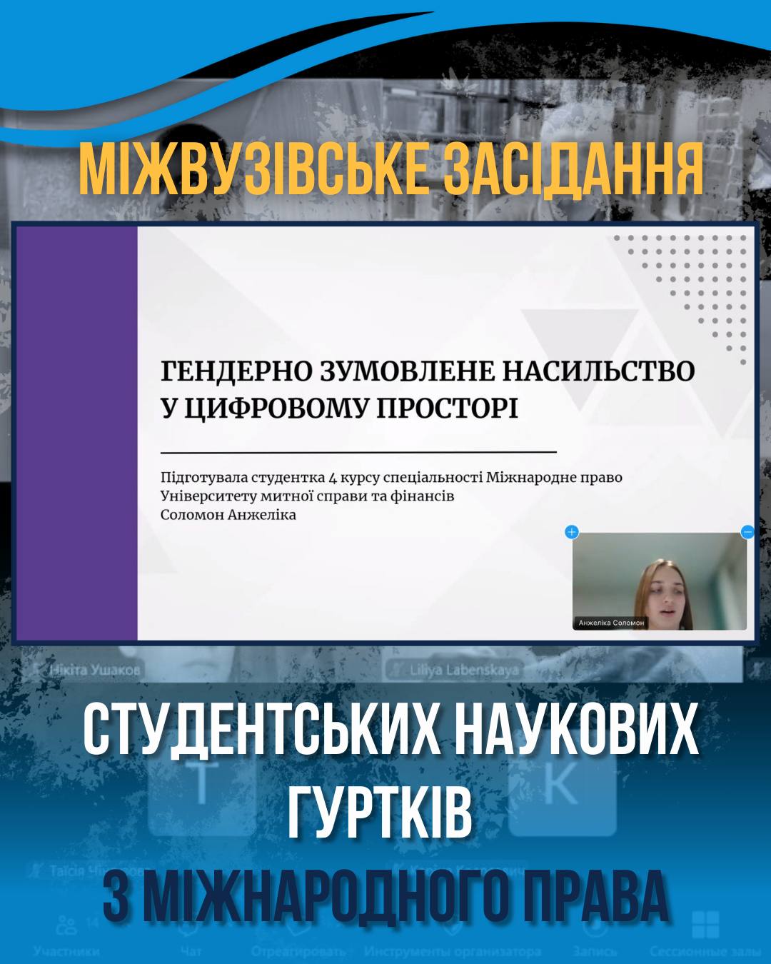 19 грудня 2025 року НПП та члени наукових гуртків кафедри міжнародного права УМСФ з нагоди Міжнародного дня прав людини взяли участь в онлайн-зустрічі з НПП із представниками студентського наукового гуртка з Міжнародного права, який діє при кафедрі міжнародного і європейського права Харківського національного університету імені В. Н. Каразіна та здобувачами освіти Харківського національного університету внутрішніх справ. Під час заходу з доповідями виступили представники Харківського національного університету внутрішніх справ, здобувачі вищої освіти юридичного факультету та НПП кафедри міжнародного і європейського права Харківського національного університету імені В. Н. Каразіна. Зацікавленість та жваве обговорення у учасників засідання викликали доповіді здобувачів вищої освіти спеціальності Міжнародне право УМСФ Соломон Анжеліки (група МП 22-2) «Гендерно зумовлене насильство у цифровому просторі» та Головченка Віктора (група МП 25-1) «Історія прав людини в міграційних процесах». Висловлюємо щиру подяку колегам з Харківського національного університету імені В. Н. Каразіна за організацію та проведення науково-комунікативного заходу.