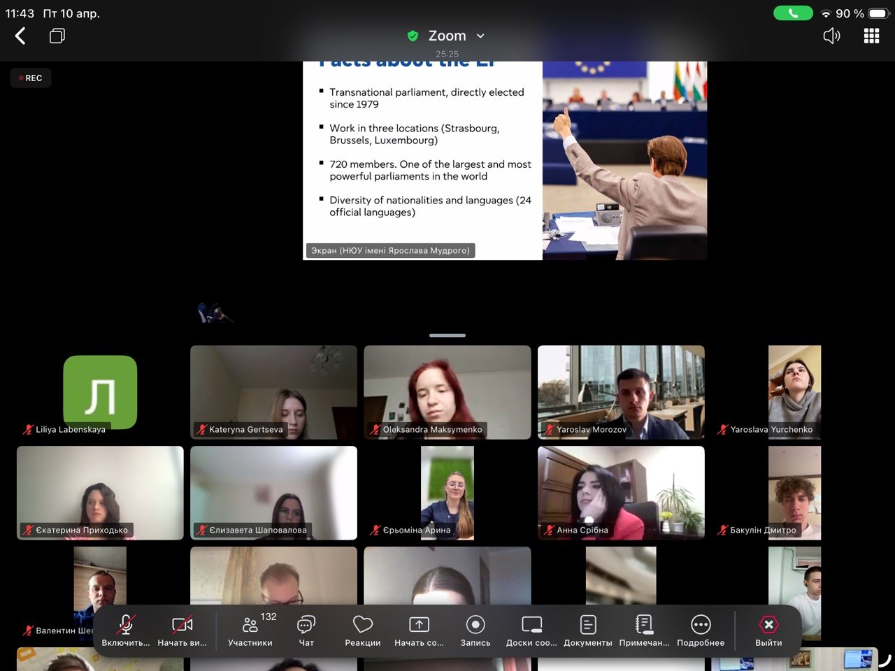 10 квітня 2026 року доцент кафедри міжнародного права Лілія Лабенська, спільно зі студентами навчальних груп МП 23-1 та МП 23-2, в рамках вивчення навчальної дисципліни «Право Європейського Союзу» взяли участь у відкритій лекції відомого литовського правника, доктора юридичних наук, професора міжнародного та європейського права, колишнього Голови Конституційного Суду Литви (2014–2021), чинного депутата Європейського парламенту, члена Європейської Комісії за демократію через право (Венеційської Комісії) та почесного доктора Національного юридичного університету імені Ярослава Мудрого Дайніуса Жалімаса на тему: “The Role of the European Parliament within the European integration and Support to Ukraine”. Під час заходу Дайніус Жалімас презентував матеріали щодо практичної реалізації компетенцій інституціями ЄС, особливу увагу приділив ролі Європарламенту в процесах прийняття спільних рішень ЄС. Значна частина заходу відбулась у формі діалогу між лектором та учасниками, обговорювались питання щодо впливу сучасної міжнародної політики на процес наближення України до ЄС. Дайніус Жалімас зазначив, що приємно вражений рівнем обізнаності студентів в сфері міжнародного права та права ЄС.