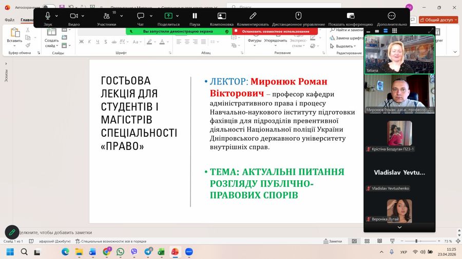 23 квітня для здобувачів вищої освіти бакалаврського та магістерського рівнів за спеціальністю «Право» було проведено гостьову лекцію на тему «Актуальні питання розгляду публічно-правових спорів».