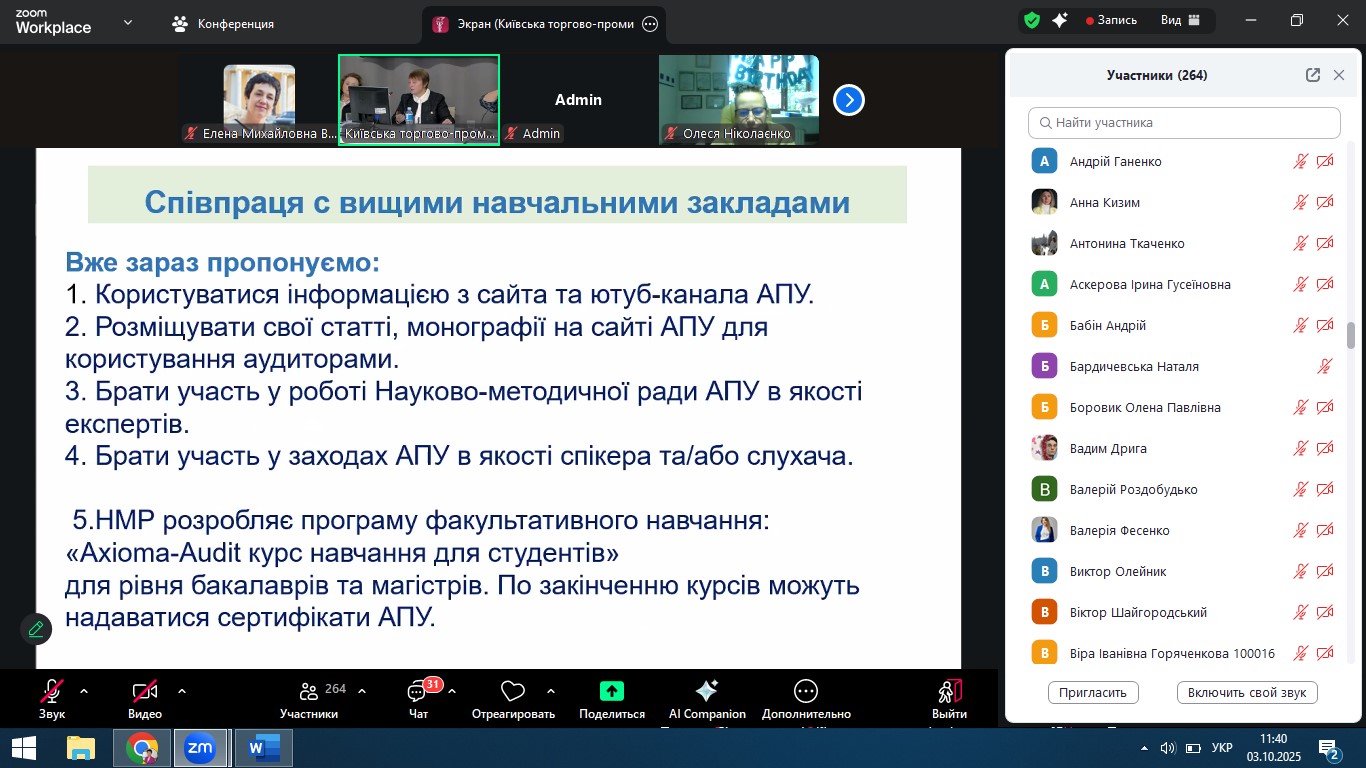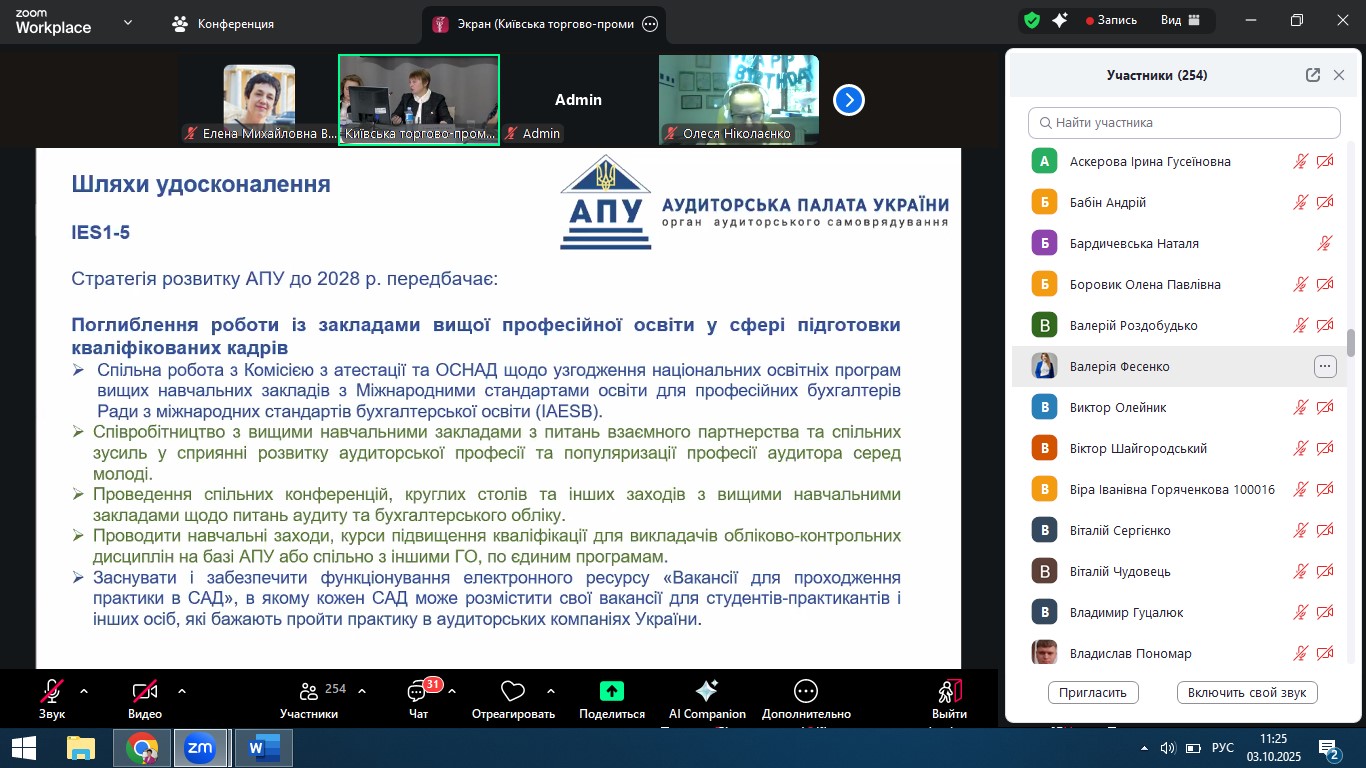 03 жовтня 2025 року професор кафедри обліку, аудиту, аналізу і оподаткування Валерія Фесенко представляла кафедру та Університет митної справи та фінансів на Всеукраїнському круглому столі, організованому Громадською організацією «Професійна організація аудиторів, бухгалтерів та викладачів обліково-контрольних дисциплін» спільно з Аудиторською палатою України. Захід відбувся у м. Київ у подвійному форматі (офлайн та онлайн) та об’єднав фахівців і науковців з усієї України.
