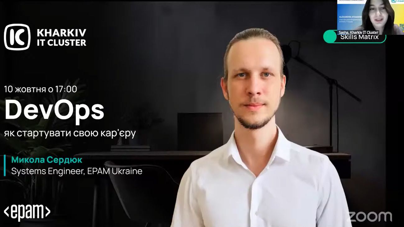 Студенти першого курсу спеціальності Комп’ютерні науки другого (магістерського) рівня вищої освіти разом з доцентом кафедри Олександром Фірсовим в рамках дисципліни Методологія DevOps прийняли участь у відкритій лекції Миколи Сердюка - EPAM DevOps engineer. Лекція є частиною серії кар’єрних консультацій, що організовані Kharkiv IT Cluster. Базове питання лекції - Як стати DevOps ?