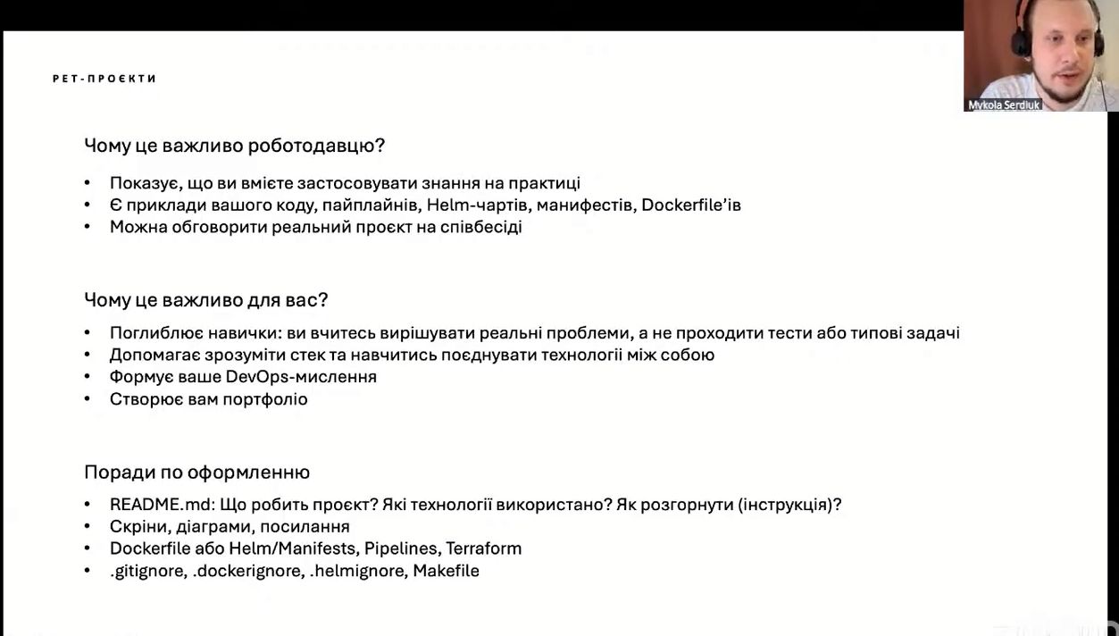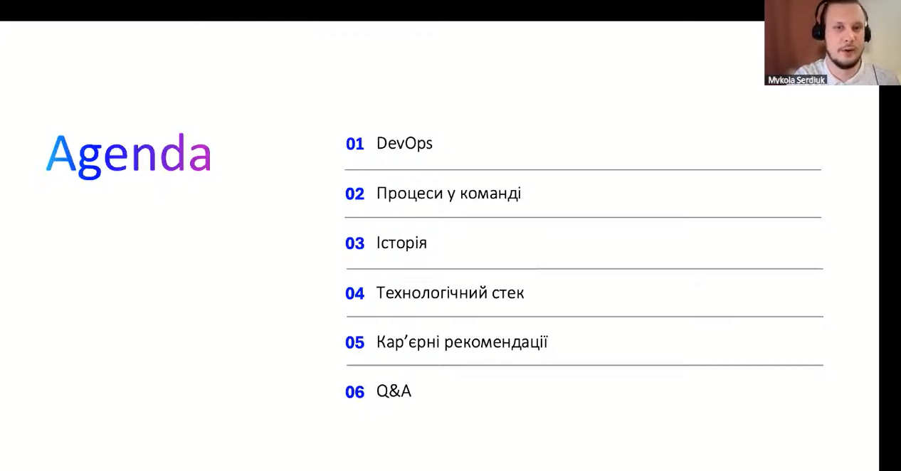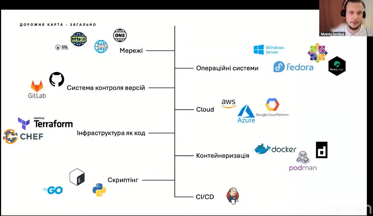 Спікер розповів про історію спеціальності DevOps, яка почалась у 2009 році.  Розглянув сучасні етапи розробки програмного забезпечення, та дорожню мапу знань, які потрібні для початківців. Оглядово було описано необхідні знання з мережевих протоколів, ОС Linux, Git, AWS та його базові сервіси, Terraform, Docker та Kubernetes. Окрему увагу було приділено концепції CICD та його інструментальній підтримки. Також розглянуто проблематику моніторингу інфраструктури.