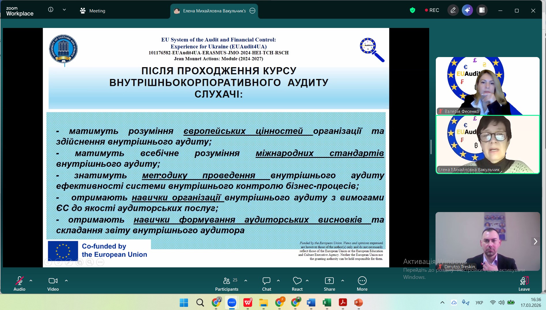 У межах презентації було представлено структуру модуля, який охоплює три ключові напрями: міжнародні стандарти аудиту та вимоги ЄС, практику державного аудиту та фінансового контролю, а також стандарти внутрішнього аудиту в приватному секторі.