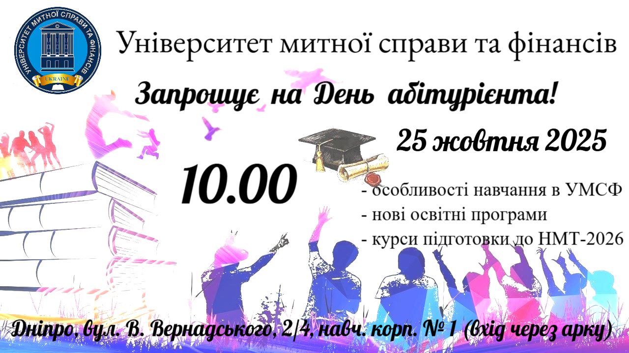 25 жовтня 2025 року о 10:00 запрошуємо всіх зацікавлених на День абітурієнта в Університеті митної справи та фінансів. Дізнайтеся про унікальні можливості навчання.