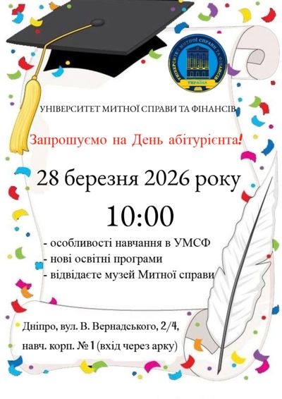 28 березня 2026 року о 10:00 запрошуємо всіх зацікавлених на День абітурієнта в Університеті митної справи та фінансів. Дізнайтеся про унікальні можливості навчання.