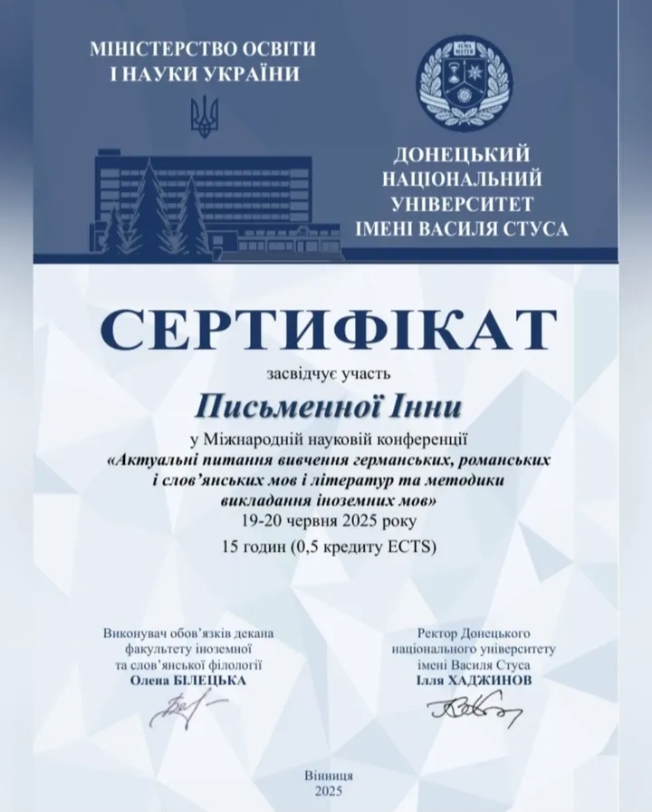 - Міжнародна наукова конференція «Актуальні питання вивчення германських, романських і слов’янських мов і літератур та методика викладання іноземних мов» Донецький національний університет імені Василя Стуса.