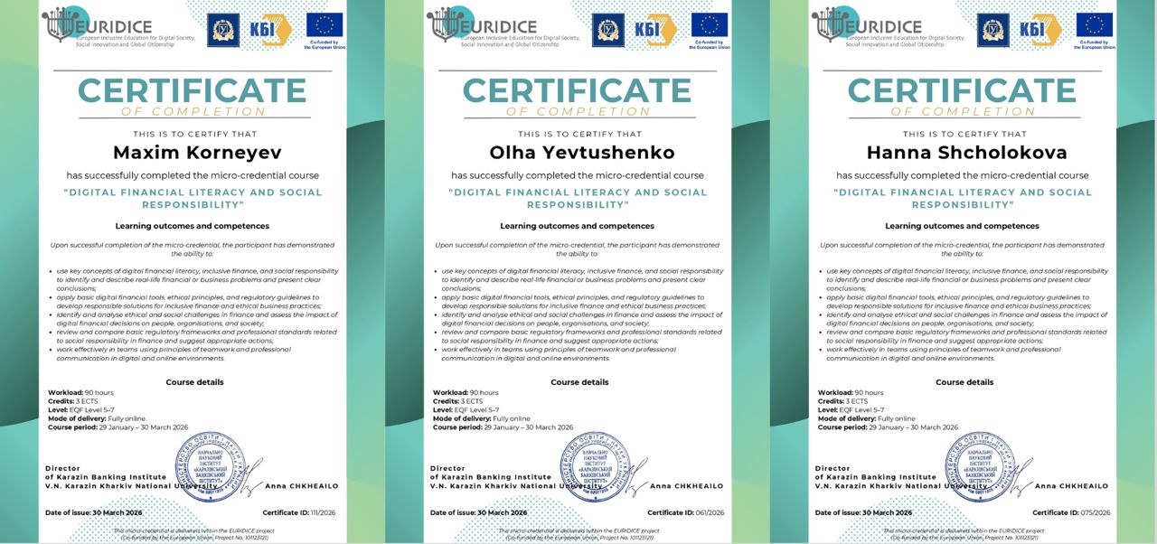 Викладачі факультету інноваційних технологій Університету митної справи та фінансів успішно завершили міжнародне підвищення кваліфікації, у рамках якого ними було пройдено англомовний курс “Digital Financial Literacy and Social Responsibility” загальним обсягом 90 годин. Цей курс є частиною міжнародного проєкту “European Inclusive Education for Digital Society, Social Innovation and Global Citizenship”.
