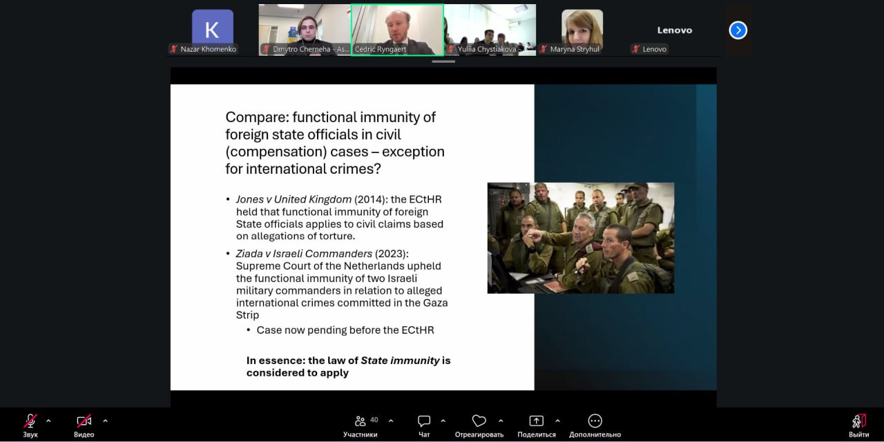 14 квітня 2026 року студенти 2 та 3 курсів спеціальності D9 «Міжнародне право» в рамках вивчення дисципліни «Кримінальне право та кримінальне процесуальне право» долучилися до гостьової лекції в межах програми IUP 2.0 – серії заходів, що об’єднують українські юридичні школи навколо актуальних питань міжнародного кримінального права. Спікером виступив Седрік Рінггарт, професор міжнародного публічного права, Утрехтського університету, який розкрив складну дилему: чи може імунітет захистити посадовця від відповідальності за міжнародні злочини? У фокусі – сучасна практика, межі імунітету та реальні виклики притягнення до відповідальності за найтяжчі злочини, що особливо актуально для України сьогодні. Лекція відбулася за підтримки Інститут Ассера TMC у партнерстві з українськими та міжнародними організаціями в межах проєкту «Відновлення гідності та справедливості в Україні». Подія стала не просто лекцією, а майданчиком для критичного мислення, професійного діалогу та занурення у реальні проблеми міжнародного правосуддя.