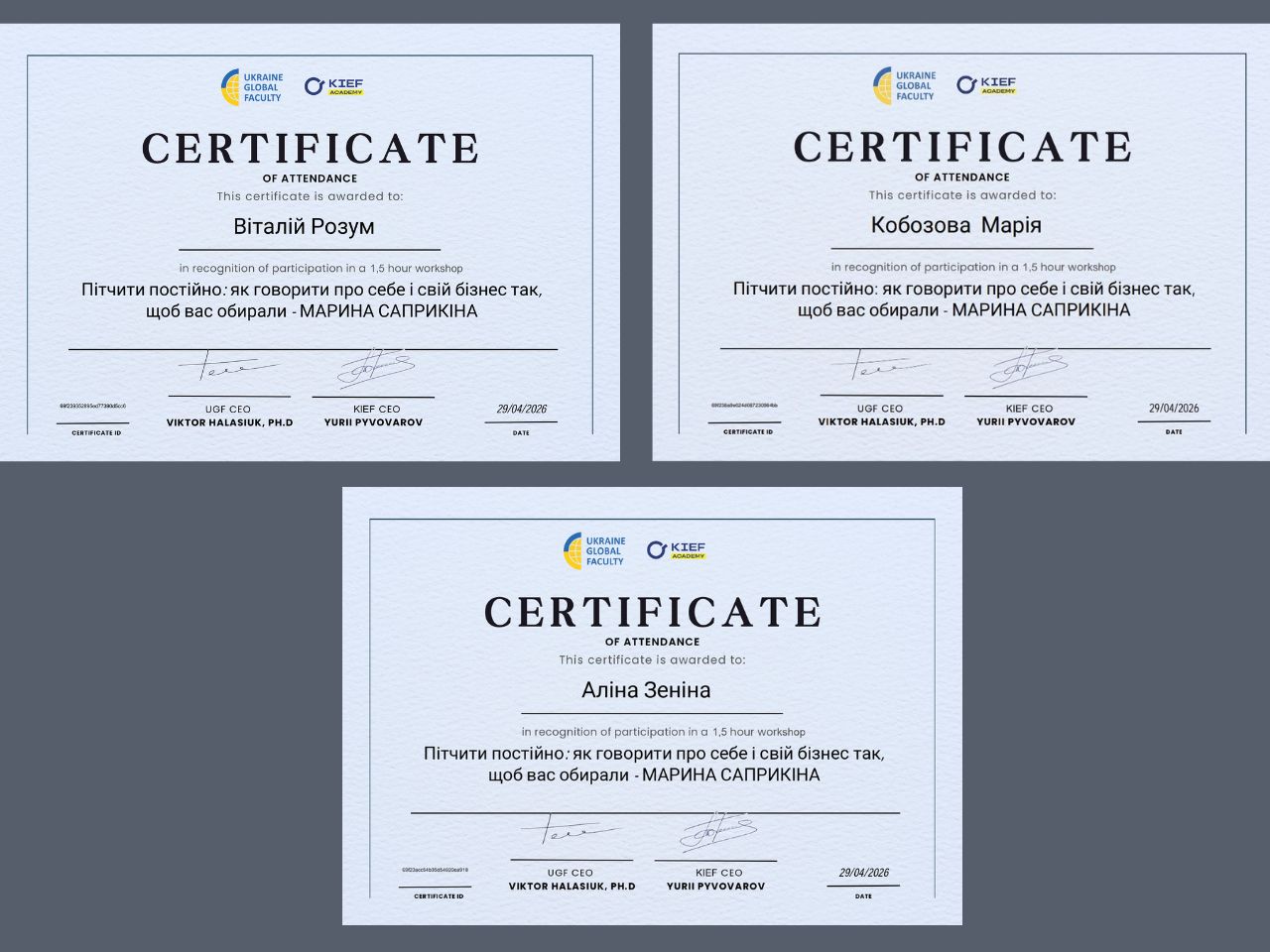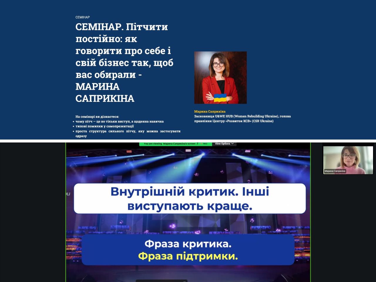 29 квітня 2026 року на міжнародній освітній платформі Ukraine Global Faculty відбувся онлайн-семінар «Пітчити постійно: як говорити про себе і свій бізнес так, щоб вас обирали». Спікеркою заходу стала Марина Саприкіна — засновниця U&WE HUB (Women Rebuilding Ukraine), голова правління Центру «Розвиток КСВ» (CSR Ukraine).