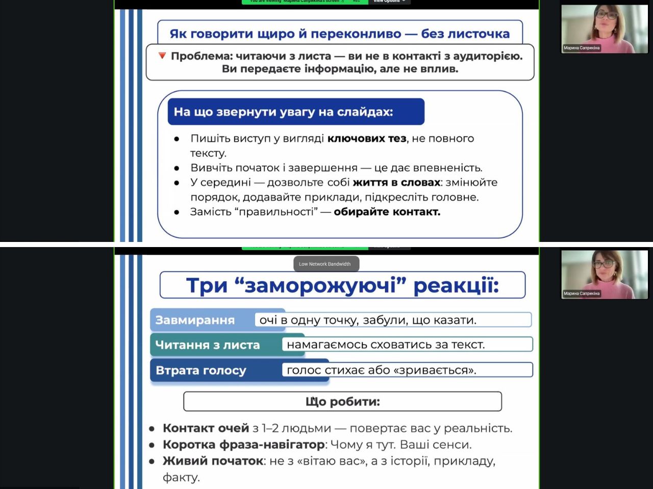 Особливу увагу було приділено подоланню хвилювання під час виступів, роботі з «внутрішнім критиком», а також формуванню впевненого та переконливого стилю комунікації. Учасники отримали практичні поради щодо того, як говорити без «читання з листка», утримувати увагу аудиторії та доносити головну ідею виступу.