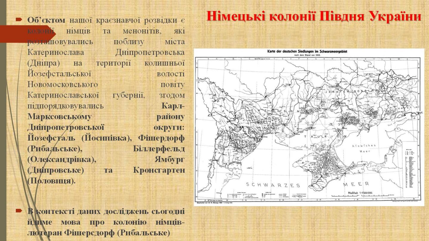 Міжнародний проект присвячений висвітленню історичної долі німців-колоністів та менонітів приміських колоній м. Дніпра (Катеринослав-Дніпропетровськ) з кінця XVIII до 1943 року та меморіалізації пам’яті представників німецької та менонітської спільноти.