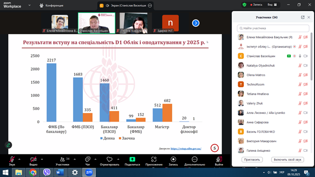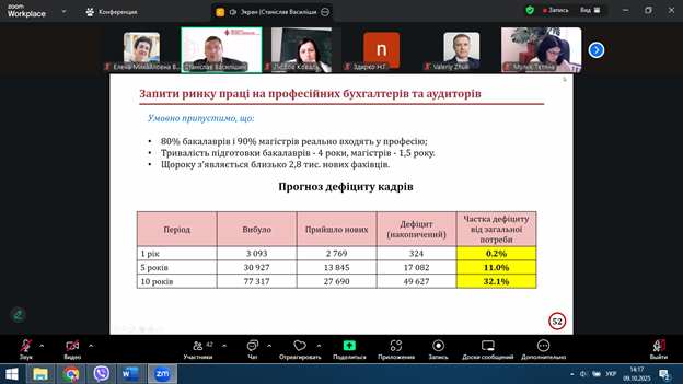 На заході обговорювались результати вступної кампанії 2025 за спеціальностями та регіонами, були проаналізовані запити ринку праці до професії бухгалтера та аудитора, вимоги роботодавців щодо досвіду, освіти та професійних навичок кандидатів. У доповіді зроблено прогноз ступеня дефіциту кадрів  на 10-річний період  та обговорені заходи щодо регулювання підготовки бухгалтерів та професії загалом. Зацікавленість у слухачів викликало дослідження еволюції трансформації місії бухгалтерського обліку та професії бухгалтера під впливом науково-технічного прогресу.