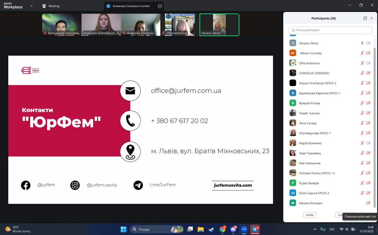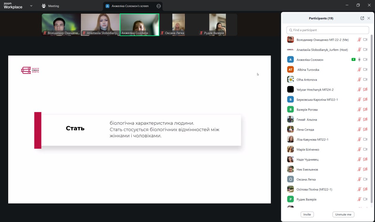13 жовтня 2025 року за підтримки кафедри міжнародного права студентка 4 курсу групи МП 22-2 спеціальності «Міжнародне право» та випускниця VII Літньої школи ЮрФем для студенток-юристок, Соломон Анжеліка спільно з юристкою та менеджеркою з розвитку академічної спільноти Асоціації жінок-юристок України «ЮрФем» Анастасією Слободяник провели онлайн-лекцію на тему: «Гендерно зумовлене насильство в практиці Європейського суду з прав людини». Перша частина лекції охоплювала питання поняття, причин існування та форм гендерно зумовленого насильства. Друга частина полягала у глибшому розумінні того, як Європейський суд з прав людини розглядає справи, пов’язані з гендерно зумовленим насильством, та які правові стандарти застосовуються для захисту постраждалих. На заході були присутні студенти спеціальностей «Міжнародне право» і «Публічне управління та адміністрування», а також викладачі відповідних кафедр. Після лекції учасники проявили активність – ставили запитання, ділилися власними думками та міркуваннями щодо проблематики насильства й дискримінації. Окрема вдячність доктору юридичних наук та професору кафедри міжнародного права Легкій Оксані Володимирівні за допомогу у проведенні такого корисного та цікавого заходу.