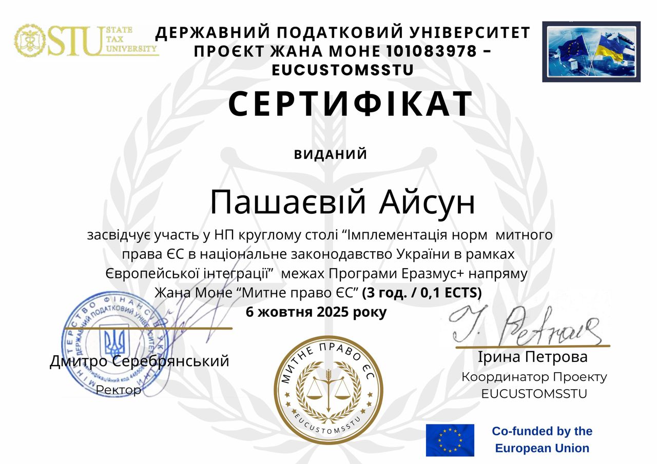 6 жовтня 2025 року завідувач кафедри міжнародного права Сергій ПЕРЕПЬОЛКІН, спільно зі студентами навчальної групи МП 25-1 ННІ права та міжнародно-правових відносин, взяли участь у науково-практичному круглому столі «Імплементація норм митного права ЄС в національне законодавство України в рамках європейської інтеграції», який відбувся на базі Державного податкового університету, в межах реалізації Проєкту ЄС Еразмус+ Жан Моне Модуль «Митне право ЄС». Під час заходу відбулася жвава дискусія щодо процесу наближення України до стандартів Європейського Союзу у галузі митного права. Учасники обговорили низку важливих питань, зокрема: особливості діяльності митних органів України, результати виконання рекомендацій Європейської Комісії у цій галузі, а також ключові положення проєкту нового Митного кодексу України. Участь представників спеціальності «Міжнародне право» УМСФ вдало поєдналася з темою науково-дослідної роботи кафедри міжнародного права та тематикою наукових пошуків членів одного з її студентських гуртків, а саме, спеціалізованого гуртка з конституційного права та права Європейського Союзу. За підсумками заходу його учасники отримали сертифікати про участь, які в майбутньому можуть бути визнані як доказ участі у неформальній освіті для зарахування додаткових балів в рамках науково-творчої діяльності за освітніми компонентами «Вступ до спеціальності» та «Конституційне право».