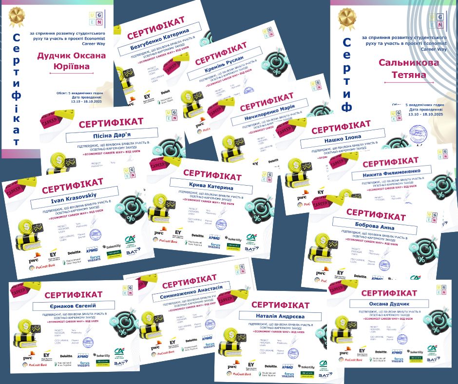 Протягом жовтня здобувачі освіти за спеціальністю D2 Фінанси, банківська справа, страхування та фондовий ринок взяли участь в проекті Economist Career Way Агентства брендингу роботодавців UGEN. Різноманітні і цікаві вебінари, які проводились фахівцями провідних компаній і установ, сприяли отриманню практичних знань у сфері бухобліку, фінансової звітності і аналізу компаній; ефективного керування власними фінансами; впливу технологій на життя, бізнес, банківську сферу; зеленого фінансування; аудиту, бізнес-консалтингу, фінансового консультування, управління ризиками підприємства, фінансового моделювання; вибудовування стратегії компанії; штучного інтелекту.
