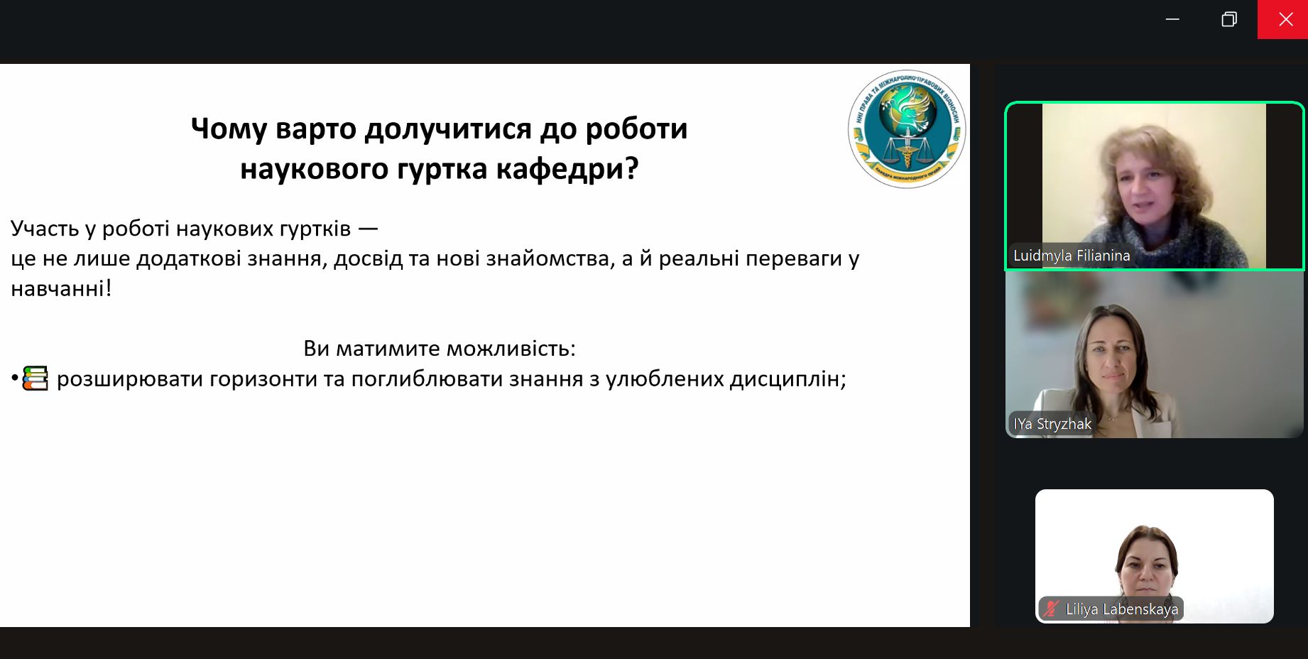 24 жовтня 2025 р. відбулось чергове спільне засідання наукових гуртків кафедри міжнародного права. Що відбулося? Після вітальних слів керівників гуртків кафедри для першокурсників виступили студенти випускного курсу про власний досвід роботи в наукових гуртках, що викликало жваву дискусію про виклики міжнародного права сьогодення. Проведена зустріч засвідчила, що наука – це не лише тексти й підручники, це живий діалог і креативні пошуки рішень! Дякуємо студентам 4 курсу міжнародного права Валерії Рудик, Анжеліці Соломон і Володимиру Онищенко за натхненний виступ і презентацію, а також всім учасникам за активність. Разом ми творимо наукову спільноту, де є місце для серйозних ідей та творчого натхнення.