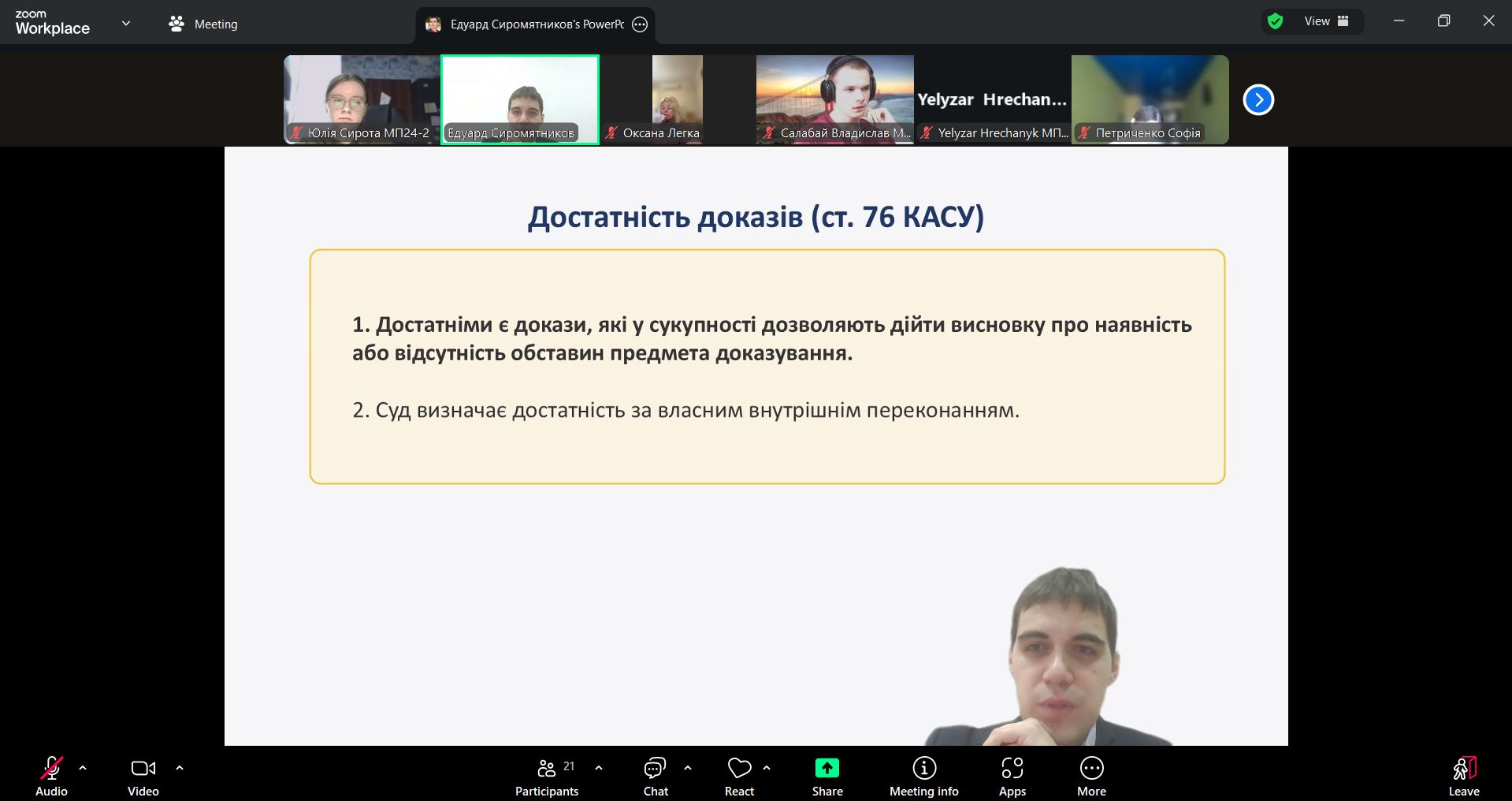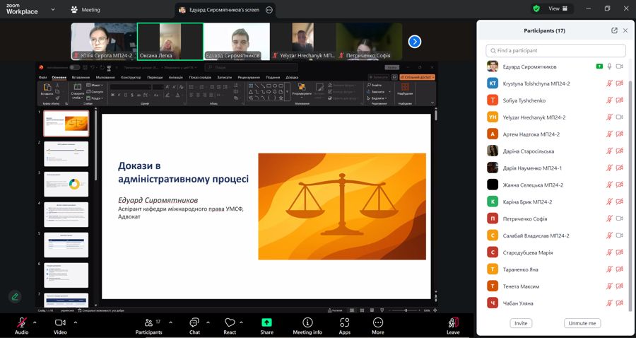 04 листопада 2025 року об 11.20, професором кафедри міжнародного права Легкою О.В. разом із адвокатом, партнером Адвокатського об’єднання «Новум» Едуардом СИРОМЯТНИКОВИМ в системі Zoom було проведено лекційне заняття для студентів груп МП-24-1,2 із навчальної дисципліни «Адміністративне право та адміністративне судочинство» на тему «Докази в адміністративному судочинстві». Під час лекційного заняття Едуард СИРОМЯТНИКОВ охарактеризував: докази як правову категорію, види доказів в адміністративному судочинстві, докази і доказування у практиці Касаційного адміністративного суду. Лекція пройшла продуктивно і спонукала слухачів до осмислення теоретичних питань та обговорення практичних викликів в адміністративному судочинстві. Едуард СИРОМЯТНИКОВ відповів на питання студентів.