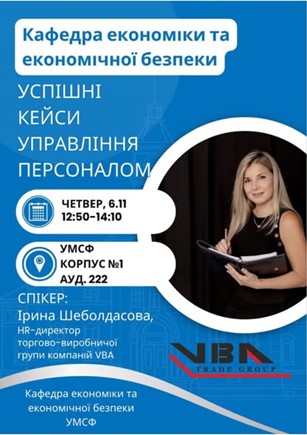 Кафедра економіки та економічної безпеки УМСФ успішно провела гостьову лекцію на тему «Успішні кейси управління персоналом» за участі Ірини Шеболдасової, HR-директора торгово-виробничої групи компаній VBA.
