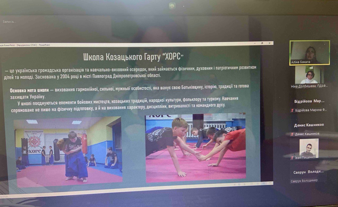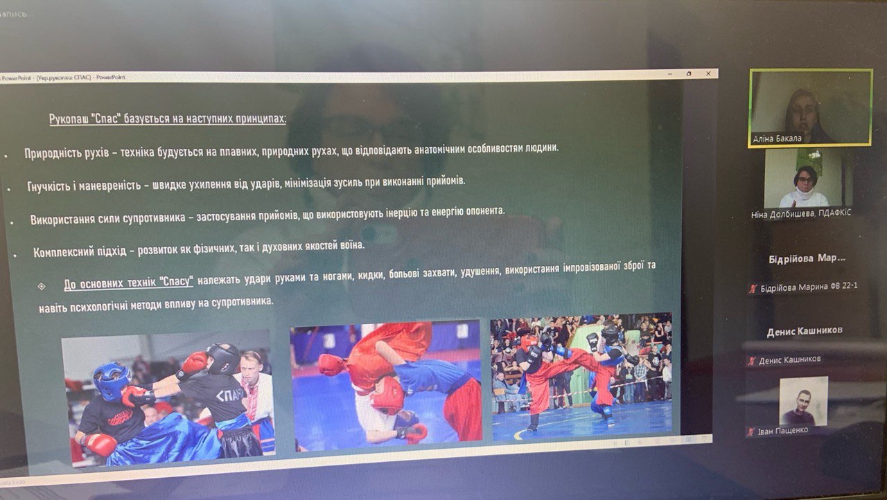 14 листопада 2025 року здобувачі спеціальності 017 «Фізична культура і спорт» мали нагоду поспілкуватися з надзвичайно цікавою гостею ‒ магістранткою 2-го курсу факультету фізичної культури і спорту Аліною Бакалою, яка провела відкриту зустріч у межах освітнього компоненту «Неолімпійський спорт» та програми національно-патріотичного виховання молоді. Темою зустрічі став «Український рукопаш Спас» ‒ унікальний національний вид єдиноборств, що поєднує бойові, культурні та виховні традиції українського козацтва.