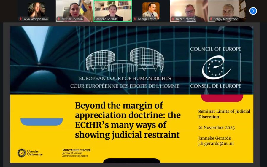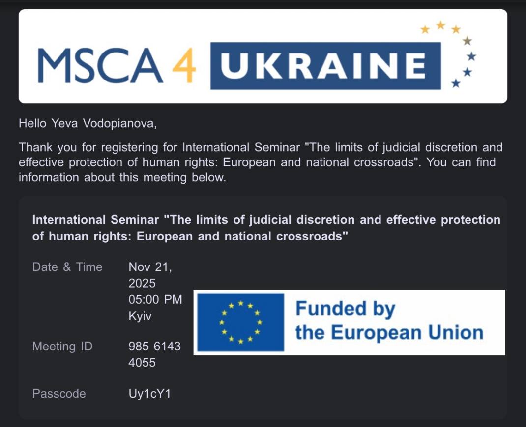 У п’ятницю 21 листопада 2025, о 17.00, Єва ВОДОП’ЯНОВА, староста гр. МП 25-1 спеціальності D9 Міжнародне право ННІ права та міжнародно-правових відносин УМСФ, долучилася до роботи Міжнародного онлайн-семінару на тему: «Межі судової дискреції та ефективний захист прав людини: європейські і національні перехрестя». В рамках визначеної теми учасники семінару обговорили проблематику легітимності судової системи та встановлення оптимального балансу між судовою дискрецією та ефективним захистом прав людини. Експерти з Великої Британії, Нідерландів та України (Джордж Летсас, Джаннеке Джерардс, Тетяна Комарова та Назарій Стецик), з урахуванням практики Європейського суду з прав людини проаналізували проблеми та досягнення впровадження європейського досвіду в рамках судової практики України. Участь в семінарі сприяла формуванню більш зваженого підходу до розуміння суддівської свободи та розширенню знань про практику ЄСПЛ і реалії її реалізації в Україні.
