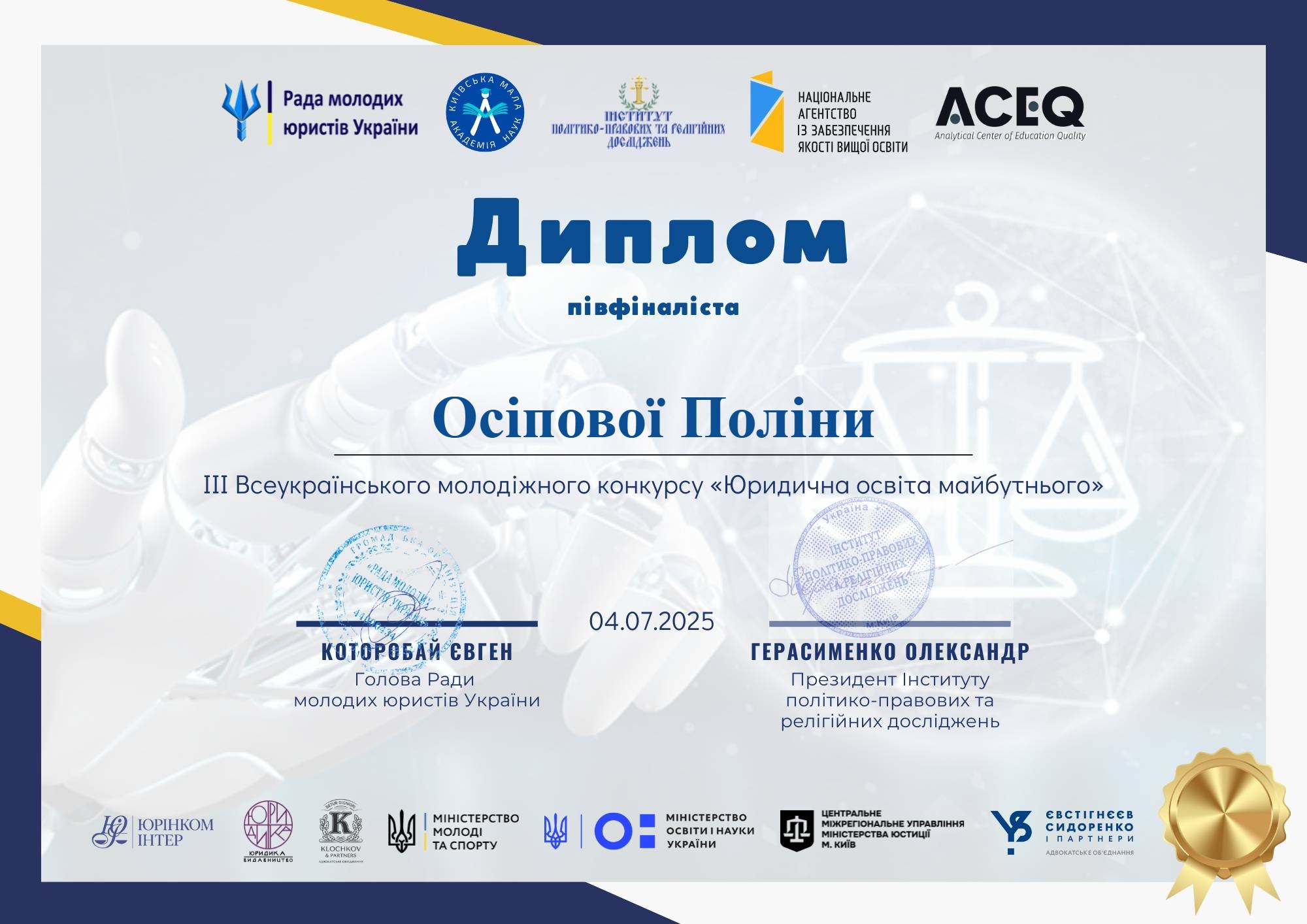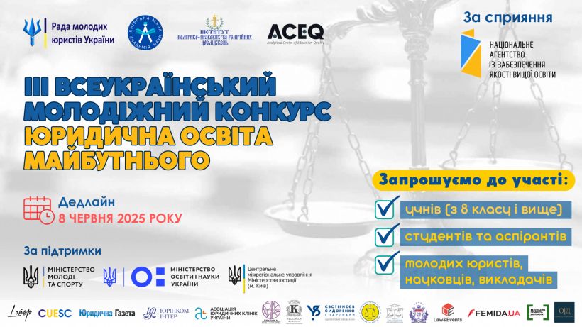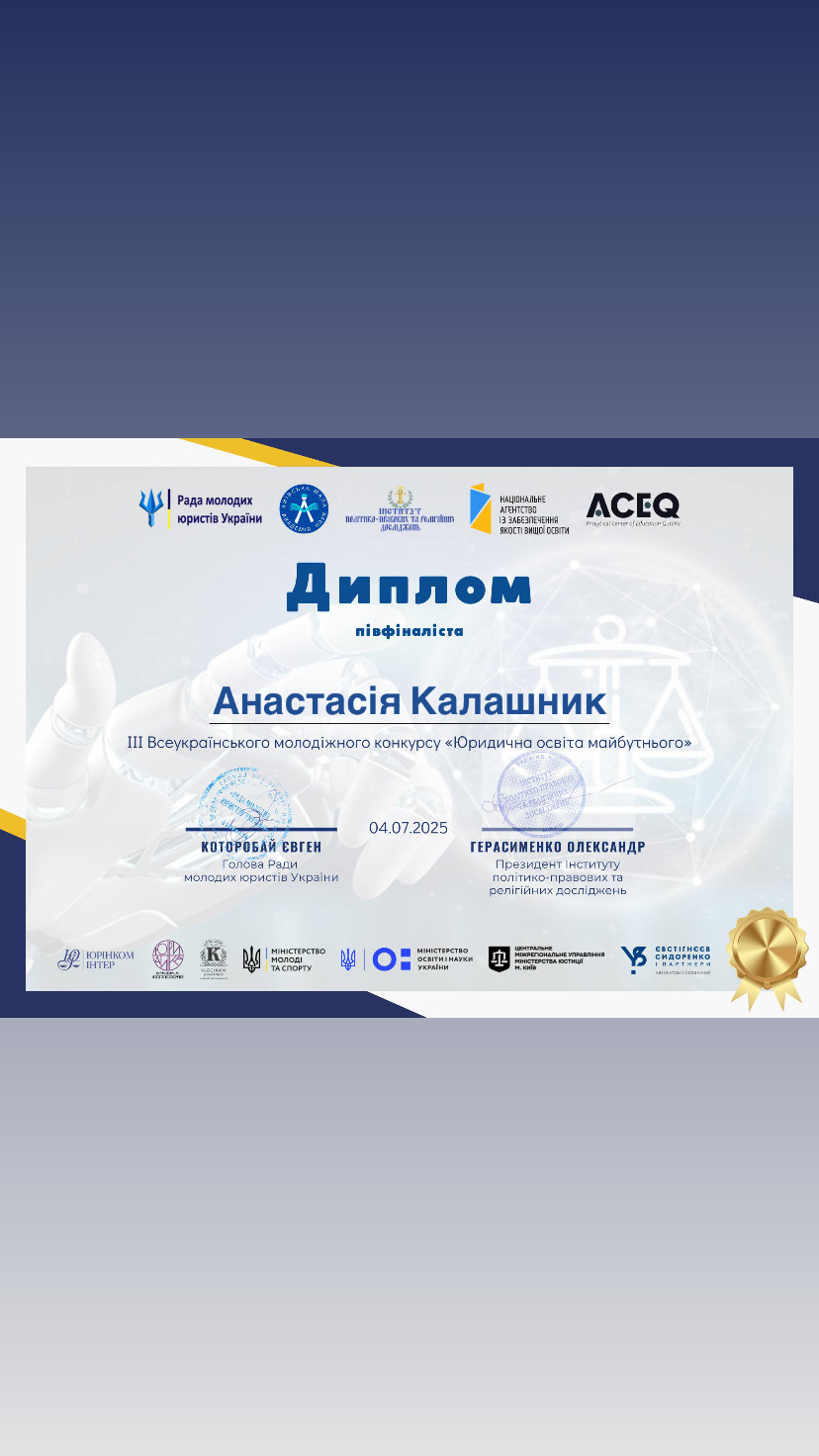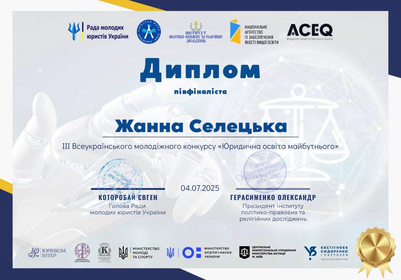 Кафедра міжнародного права ННІ права та міжнародно-правових відносин УМСФ вітає студенток ОП «Міжнародне право» Поліну ОСІПОВУ (МП 22-1), Анастасію КАЛАШНИК (МП 23-1) та Жанну СЕЛЕЦЬКУ (МП 24-2) з успішною участю в ІІІ Всеукраїнському молодіжному конкурсі «Юридична освіта майбутнього» у 2025 році на тему: «Чи готує юридична освіта справжніх фахівців: що потрібно змінити вже сьогодні?». Метою Конкурсу є: підтримка обдарованої молоді та внутрішньо переміщених осіб; виявлення проблемних питань юридичної освіти та шляхи їх вирішення; залучення студентів до процесів покращення якості вищої освіти в Україні; залучення молодих науковців до інтеграції юридичної освіти в європейський освітній простір. Організаторами Конкурсу були: Рада молодих юристів України; Київська Мала академія наук учнівської молоді; Інститут політико-правових та релігійних досліджень; Аналітичний центр якості освіти. Захід було проведено за сприяння Національного агентства із забезпечення якості вищої освіти та за підтримки Міністерства молоді та спорту України, Міністерства освіти і науки України, Центрального міжрегіонального управління Міністерства юстиції.