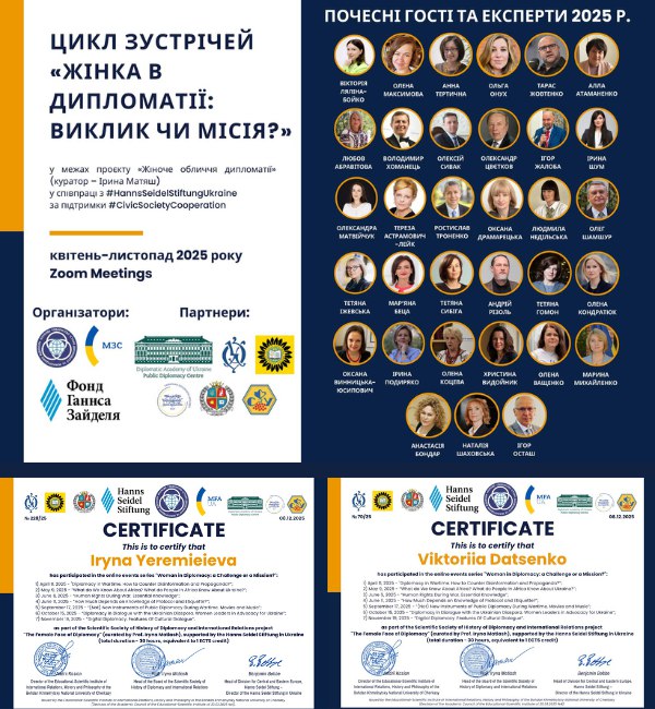 Вікторія Даценко, декан факультету економіки, бізнесу та міжнародних відносин Університету митної справи та фінансів, директорка Центру публічної дипломатії УМСФ та Ірина Єремєєва, завідувачка кафедри міжнародних відносин, координаторка Центру публічної дипломатії УМСФ, взяли участь у науково-освітньому проєкті та отримали сертифікати про підвищення кваліфікації.