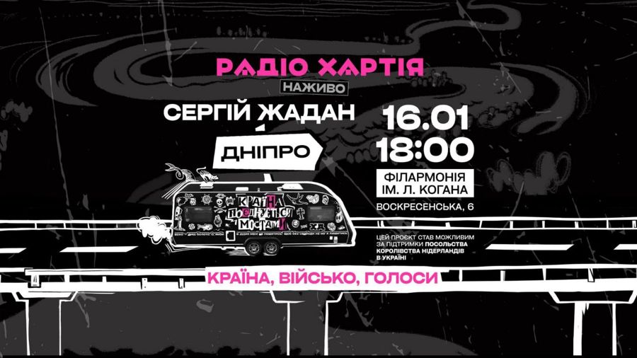 Цієї п'ятниці, 16-го січня, о 18:00 в Дніпропетровській філармонії відбудеться офлайн-програма Радіо Хартія (живий ефір) з Сергієм Жаданом, Оленою Гусейновою, Євгеном Турчиновим та ще багатьма цікавими людьми. Вхід вільний, за попередньою реєстрацією: https://surl.li/usdjjn