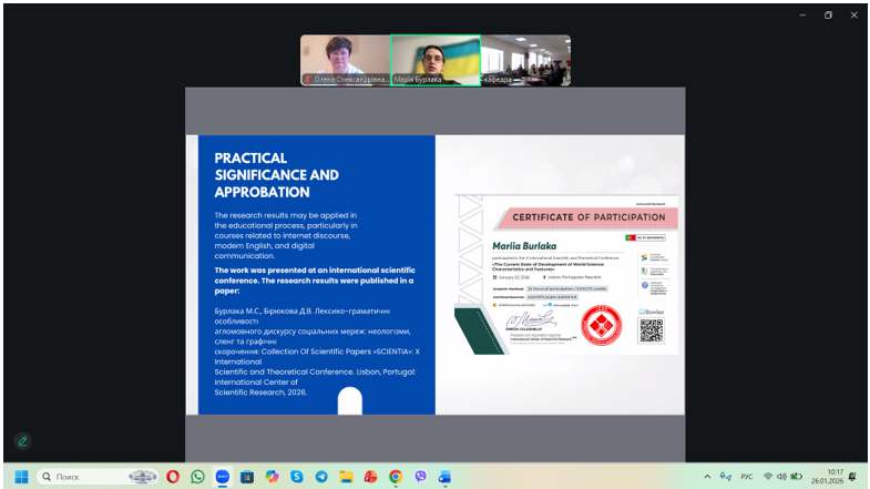 26 та 27 січня 2026 року на базі Університету митної справи та фінансів відбувся успішний захист магістерських дипломних робіт здобувачів освіти групи ФЛ-24-1зм кафедри іноземної філології, перекладу та професійної мовної підготовки. Захисти проходили у змішаному форматі — офлайн та онлайн, що забезпечило комфортні умови для всіх учасників освітнього процесу.