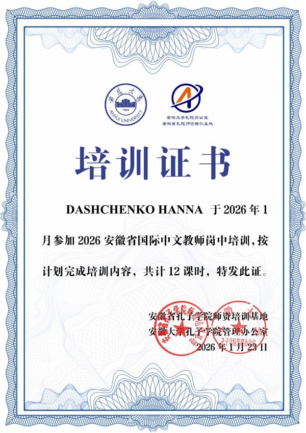 ​Протягом січня 2026 року вона проходила інтенсивне навчання на базі Інституту Конфуція провінції Аньхой. Курс передбачав 12 академічних годин інтенсивних занять, присвячених актуальним методикам викладання та сучасним освітнім технологіям. За успішне виконання навчального плану пані Ганна отримала офіційний сертифікат міжнародного зразка.