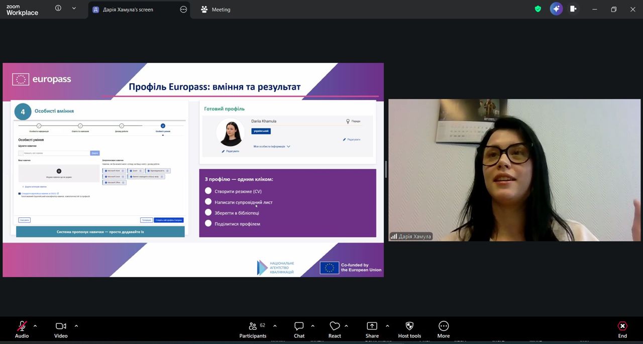Онлайн-презентацію європейських інструментів провели представниці Національного агентства кваліфікацій: Маргарита Поліщук – керівниця проєктного управління секретаріату агентства; Яна Бобирець – керівниця відділу супроводження Euroguidance проєктного управління секретаріату агентства; Дарія Хамула – керівниця відділу супроводження Europass; Віола Штоль – провідна фахівчиня відділу супроводження Euroguidance.