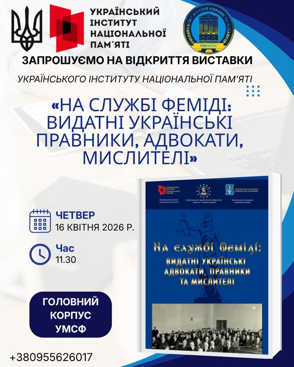 У рамках Меморандуму про співробітництво з Українським інститутом національної пам’яті (м. Київ) 16 квітня 2026 р., об 11.30 відбудиться відкриття виставки «На службі Феміді: видатні українські правники, адвокати, мислителі». Ця виставка — це не лише історія державності, права, це історія боротьби за свободу, гідність і незалежність України. Адже, українські історики та правники були не просто фахівцями – вони були носіями національної ідеї, творцями державності та захисниками прав людини. ЗАПРОШУЄМО ВАС!