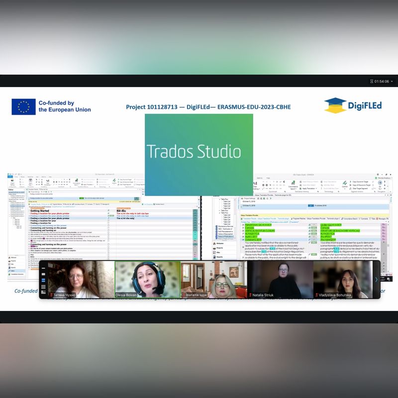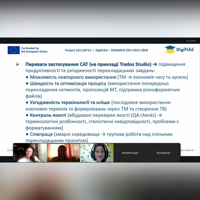 Вона представила університетську команду, яка долучилася до створення курсу Translation Technologies, а також розповіла про платформу Trados Studio – одну з провідних систем автоматизованого перекладу, яку активно використовують професійні перекладачі й агенції.