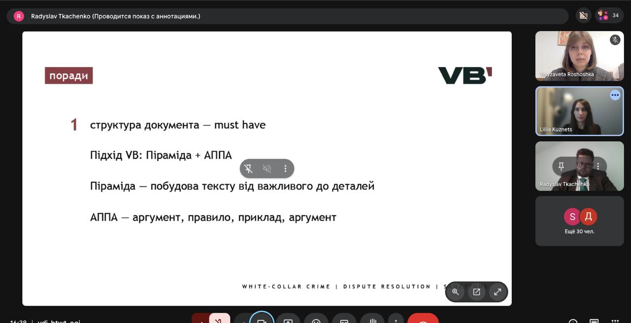 1 квітня 2026 року студентка магістратури спеціальності «Право» Рошошка Єлизавета взяла участь у  науковому вебінарі «Підготовка якісного процесуального документа: практичні поради», організованому ELSA Kyiv спільно з юридичною компанією VB Partners.