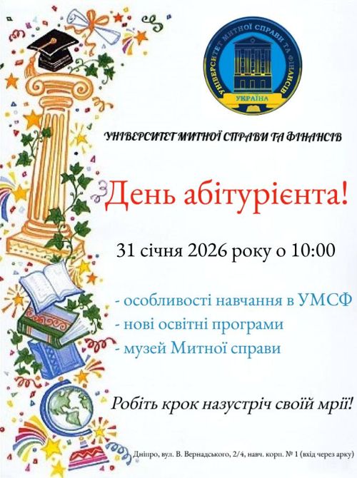 31 січня 2026 року о 10:00 запрошуємо всіх зацікавлених на День абітурієнта в Університеті митної справи та фінансів. Дізнайтеся про унікальні можливості навчання.